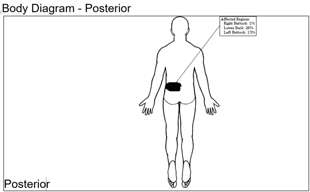 The patient’s chief complaints were of localized pain in the upper inner quadrant of the buttock. (Figure 1) The symptoms were primarily on the left, and he felt that he had to sustain a constant contraction of his lumbar and leg muscles to keep from experiencing the same pain (to a lesser degree) on the right. He reported constant pain and was unable to find a position of comfort.
